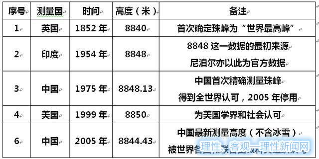 不同的国家在不同的时间去测量珠峰高度,因为测量方法和测量精度的不同,得到的数据还是有一定差距的。