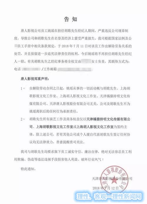 12日,这份落款为“天津唐人影视股份有限公司”的文件显示:“唐人影视公司员工姚瑶在担任胡歌经纪人期间,严重违反公司规章制度,导致公司和胡歌先生在名誉及经济上蒙受严重损失,我司根据国家法例及公司员工手册中相关条款规定,于2018年7月11日对该员工作出解除劳务关系的处罚,并且保留进一步追究法律责任的权利。”文件还称,“我司与胡歌先生均要求旗下员工诚实守信、廉洁自律,绝对无法容忍员工利用欺骗、伪造等违法违规手段损害他人利益、破坏行业风气。”
