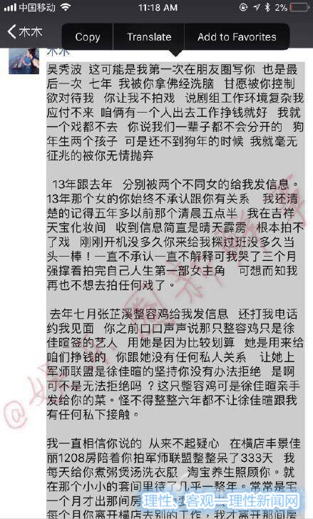 文中这样开头:“吴秀波,这可能是我第一次在朋友圈写你,也是最后一次,七年,我被你拿佛经洗脑,甘愿被你控制欲对待我,你不让我拍戏,说狗年生两个孩子...我就毫无征兆的被你无情抛弃。”
