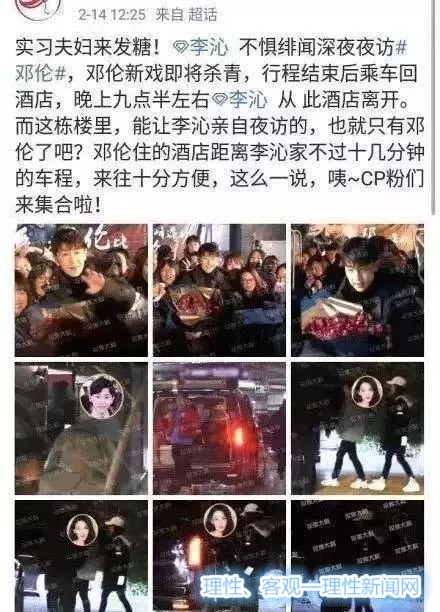 花椒大料爆料称:“实习夫妇来发糖!李沁不惧绯闻深夜夜访邓伦,邓伦新戏即将杀青,行程结束后乘车回酒店,晚上九点半左右李沁从此酒店离开。而这栋楼里,能让李沁亲自夜访的,也就只有邓伦了吧?邓伦住的酒店距离李沁家不过十几分钟的车程,来往十分方便,这么一说,咦~CP粉们来集合啦!”下面还配了6张他们两个人的图片,看得出来并不是空穴来风。