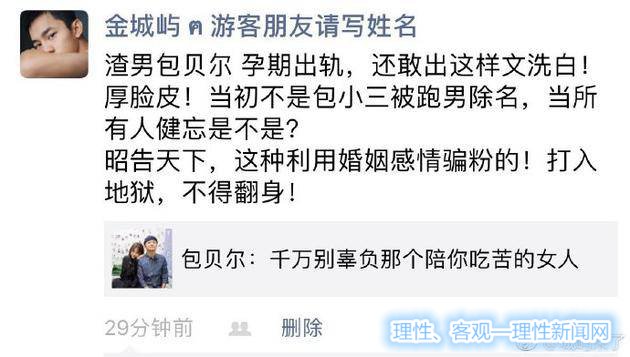 27日,有网友在微博晒出一张截图并配文称:“包贝尔洗白出轨,不可原谅,厚脸皮”。该截图内容为朋友圈中有人转发了一篇名为《包贝尔:千万别辜负那个陪你吃苦的女人》,还表示:“渣男包贝尔孕期出轨,还敢出这样文洗白!厚脸皮!当初不是包小三被跑男除名,当所有人都健忘是不是?昭告天下,这种利用婚姻感情骗粉的!打入地狱,不得翻身!”