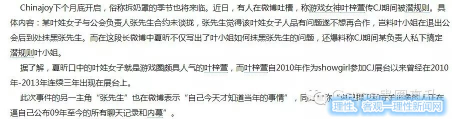而此后,叶MM再次进入广大同行视线,应该就是她和她的推手张展豪的撕逼大战,当年在业内也传的沸沸扬扬。具体的撕逼原文各位可以自行百度,简单的来说就是某知情人士X在微博中透露“某叶姓女子与公会负责人张先生合约未谈拢,张先生觉得该叶姓女子人品有问题遂不想再合作,岂料叶小姐在退出公会后到处抹黑张先生。而在这段长微博中夏昕不仅写出了叶小姐如何抹黑张先生的问题,还爆料称CJ期间某负责人私下搞定潜规则叶小姐。"
