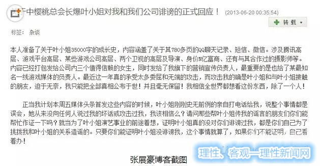 随后,中樱桃CEO张展豪,也就是一手捧红叶梓萱的推手也跳出来说自己已经准备好一份资料。内容涉及叶梓萱的成长史,以及与腾讯、某游戏公司、卫视高层的聊天记录等。