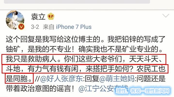 我把铅锌写成铀矿是我不专业,我只是救助病人,你们这些大老爷们天天斗天斗地,有力气有钱有闲,来搭把手如何,农民工也是同胞。 看到没,无论怎么造谣、抹黑只要扛出慈善的挡箭牌马上就变成圣母而且还能倒打一耙,