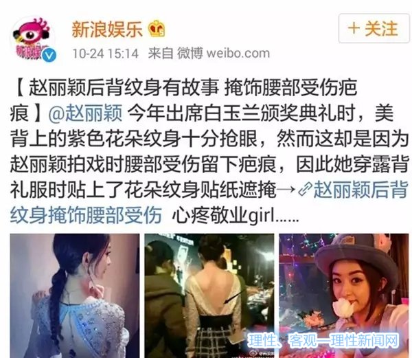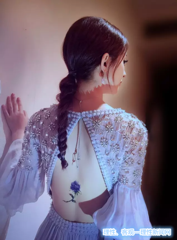 她有次拍戏吊威亚伤到后背,出席活动为了穿露背礼服不被看出有伤,只能用纹身贴纸遮盖。