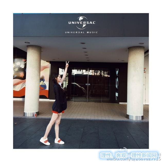 照片中的她身穿红色短裙,半搭黑色外套,蹬着一双运动鞋的大长腿格外引人注目。