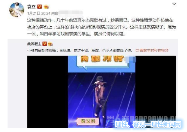 一石激起千层浪,男爱豆的粉丝们表示看不惯袁立这满满的优越感,“影视演员”拍裸露镜头是为艺术献身,怎么男艺人跳舞就是性暗示?也有网友对表示支持,认为“小鲜肉”的粉丝群体较为年轻,有些舞蹈动作确实不太合适容易误导小朋友,致敬经典应该适度。