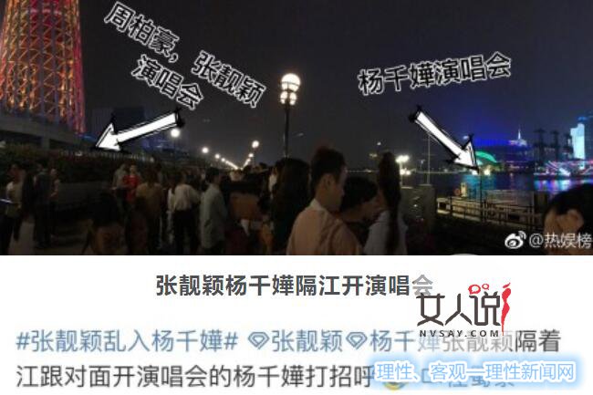昨晚广州可谓群星荟萃,周伯豪,刘惜君,张靓颖和杨千嬅等人都在广州召开演唱会。还有网友绘制了几人演唱会地址,其中张靓颖和杨千嬅的演唱会仅隔了一天江,有观众表示张靓颖唱海豚音的时候,都听不清杨千嬅的歌声了。 张靓颖还隔江向千嬅姐打了招呼,这波操
