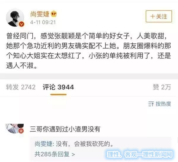 闹得最厉害的时候,当事人冯轲和张靓颖都没有回应这件事情,反而尚雯婕跳出来说“冯轲配不上张靓颖”,还指责(知心大姐)文雅太想红,让人大跌眼镜,当事人都没有回应,尚雯婕难逃蹭热度的嫌疑。