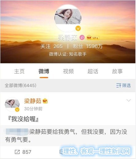 “某网友”在微博中发博表示:“梁静茹要给我勇气,但我没要,因为没有勇气要。”随后,梁静茹本尊在微博中回复:“我没给哦!”