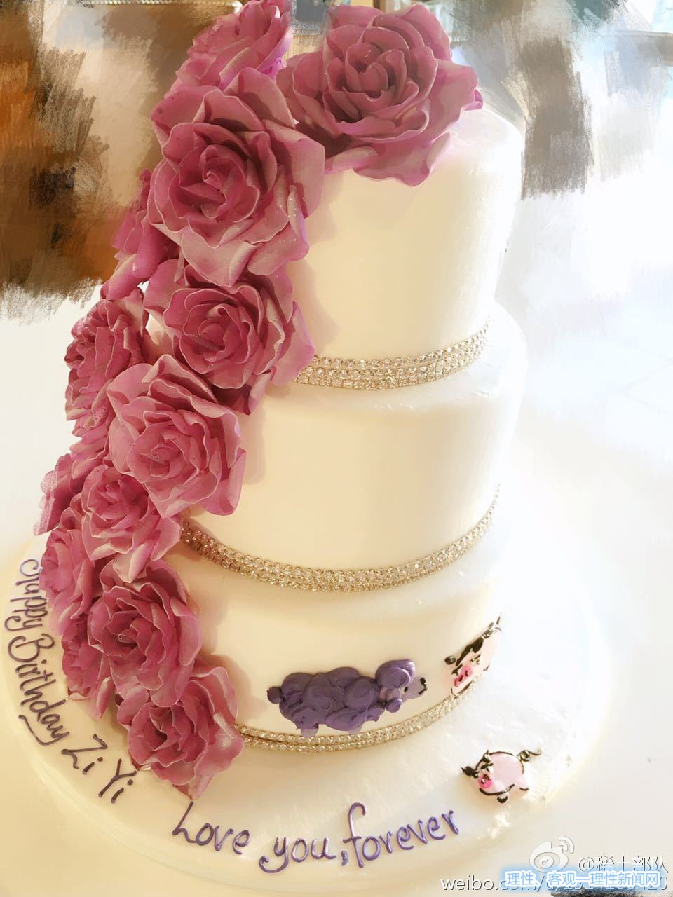 在她面前则摆着一个三层的生日蛋糕,蛋糕镶嵌了一串粉色花朵,下方还写着“Happy Birthday zi yi Love you,forever”。另外,很有心的是,蛋糕上还绘羊和猪的卡通图案,这分别是章子怡和汪峰的生肖。