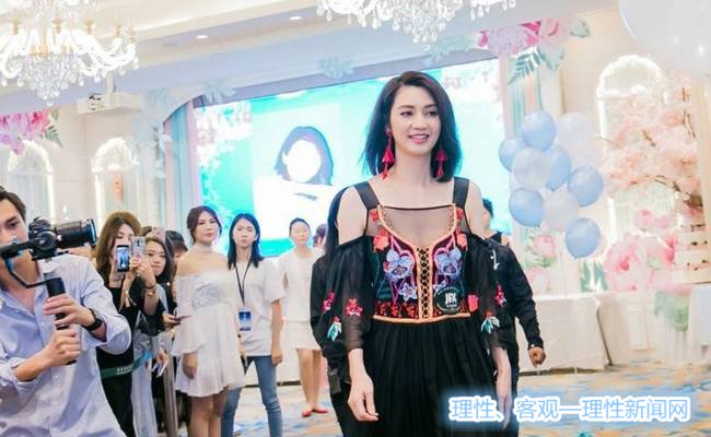 照片中,洪欣穿着黑红刺绣露肩长裙,短发披肩,妆容精致,戴着长长的红色耳坠,非常端庄,依然保持着昔日女神的风采。