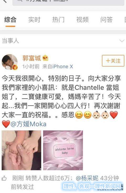 方媛自嫁给郭富城生下女儿之后,又怀上了二胎,前阵子方媛还挺着巨肚散步,今天4月18日,天王郭富城在微博公布了妻子方媛诞下二胎喜讯,郭富城表示:“今天我很开心,特別的日子。向大家分享我们家里的的小喜讯:就是Chantelle当姐姐了,二宝健康可爱,妈妈辛苦了!今天起......我们一家开开心心四人行!再次谢谢大家一直的祝福。感恩”。