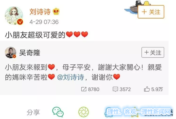 终于生啦! 今天早上7点36分吴奇隆发文宣布妻子产子喜讯:小朋友来报道到[心],母子平安,谢谢大家关心!亲爱的妈咪辛苦啦,谢谢你! 吴奇隆和刘诗诗2011年结缘于《步步惊心》。 2013年11月13日凌晨,吴奇隆在微博上首先发布消息承认与刘诗诗的恋情。 2015年