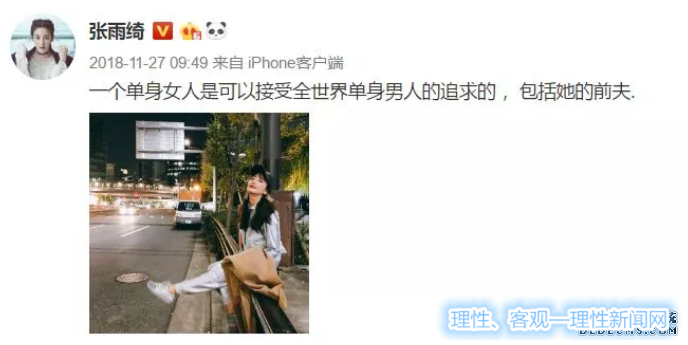 张雨绮在感情方面一直敢作敢当。早前和袁巴元离婚之后,在微博表示单身女人能接受所有人的追求,包括前夫。