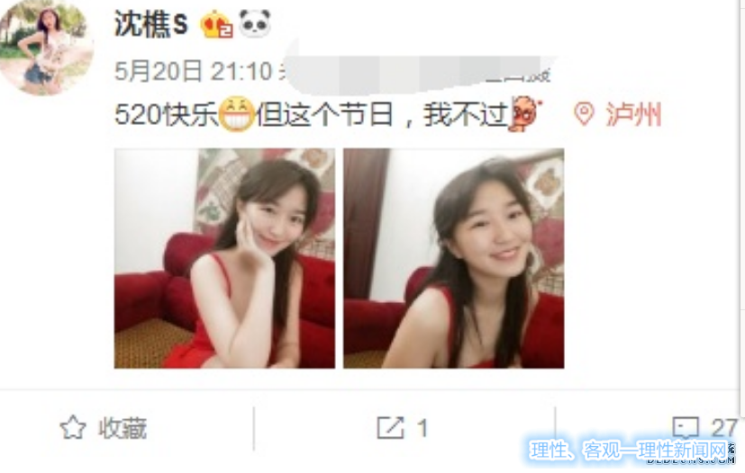 5月20日晚上,沈樵晒出两张自拍照,配文说:520快乐,但这个节日,我不过!照片中她身穿红色吊带裙子,笑容满面,看来已经从拘留阴影走出来了。