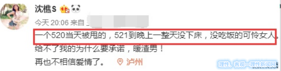 后来她发文表示自己被男友抛弃了,配文说:一个520当天被甩的,521到晚上一整天没下床,没吃饭的可怜女人。给不了我的为什么要承诺,暖渣男!再也不相信爱情了。