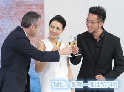 高圆圆与老外举杯畅饮 细看鱼尾纹明显。
