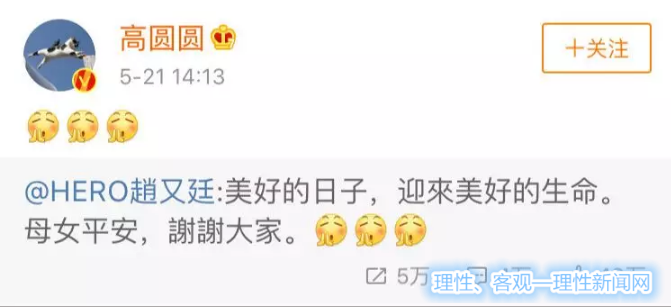 随后,高圆圆转发微博,用三双鼓掌的小手表达初为人母的喜悦。