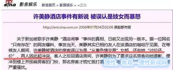 关于这件事还有一种说法。燕赵都市报称,一位名为“只有存在”的网友爆料,事发当天,许美静与友人相约在丽嘉酒店的咖啡厅见面,在她等朋友期间,一位房客误以为她是小姐,跑过来讨价还价,许美静气不过,与房客对峙起来。