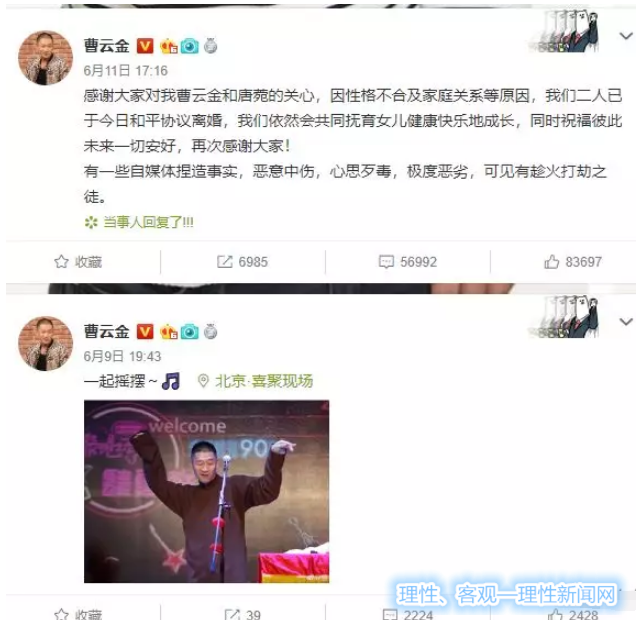 其实从两人的正面回应离婚事件的上一篇微博中,给人的感觉,离婚对于他们俩而言,心情是完全不同的,唐菀5月31日微博发的是“为母则刚”,透着无奈与坚强。而曹云金6月9日发的是“一起摇摆”,给人感觉心情是愉悦的。