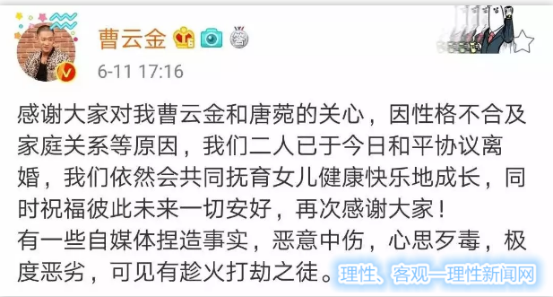 最近,相声演员曹云金离婚的事儿,上了热搜。先是,曹云金被曝和妻子唐菀办理了离婚。迫不得已,曹云金在微博回应了此事,说:离婚是因为性格不合,和平分手、将共同抚育女儿成长。并且怼了一波“捏造事实、恶意中伤”的人。