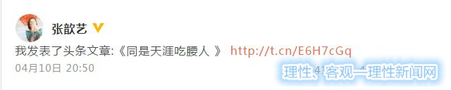 4月10日晚,张歆艺通过微博发表长文,讲述陪老公回武汉所经历的一件事,并配上“同是天涯吃腰人”的标题自侃。文中张歆艺称哄完娃睡觉的空隙和老公溜出来享受美食,但不幸被隔壁桌的人议论自己都不知道的八卦。