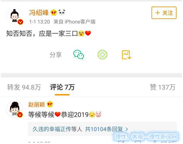 不仅事业上红红火火的她,在感情上也得到了一个非常好的归宿。去年十月份赵丽颖和大她9岁的冯绍峰两人在微博正式宣布结婚的消息,还引发了一大波的官宣体。2019年开年元旦冯绍峰发文称知否知否,应是一家三口赵丽颖