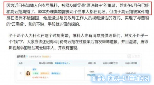 该知情人还透露了两人在这个时刻离婚的原因,是与今年4月份的唐德起诉高云翔有关,目前经过查询董璇并不是北京艺璇公司的法人,但该媒体称通过企业查询网站发现,公司目前的实际控制人和受益所有人皆是董璇,疑似是董璇为了保护个人财产不受牵连。
