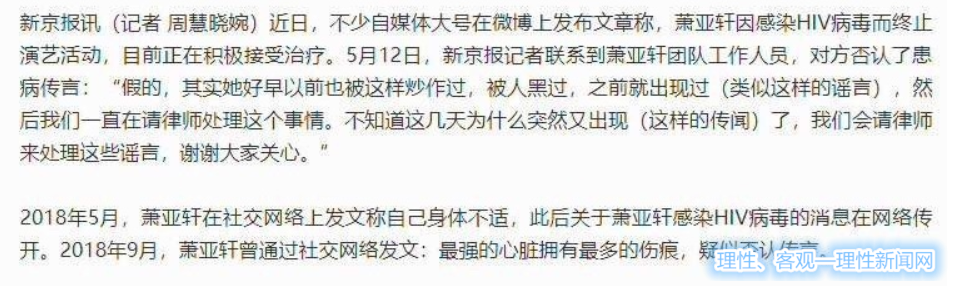 此后关于萧亚轩感染艾滋病病毒的消息便在网上蔓延开来,很多的网络媒体便针对此事大范围报道。终于,萧亚轩在去年9月份,在社交平台发文,并称“最强的心脏拥有最多的伤痕”,疑似针对网传艾滋病病毒一事作出回应,否认传言。