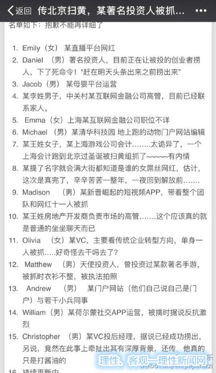 23日晚,北京警方扫黄查获涉案嫌疑人数百名。随后网上流传出一份被抓嫌疑人名单,称有多位网红、互联网大佬与投资人在内,其中有一条内容“某提了名字就会满大街都知道的女屌丝(划重点)网红”,不少网友将怀疑的目光投向了papi酱,更有大V影射papi酱。