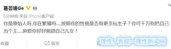 而葛荟婕吐槽的对象应该不是章子怡,而且汪峰,怒怼对方只想着繁育,生了一个又一个的意思。而葛荟婕的语气也是相当激烈的,直接吐槽对方“繁殖”,还有点暗示汪峰还有私生子的意思,怒怼汪峰:“别把自己当个王”,当然最后一句话还是说出了真实目的,说了这么多,无非也只是想要对方好好照顾女儿罢了,也是一种护犊情深。