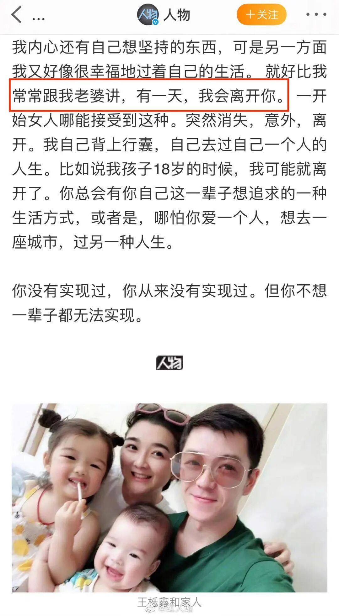 每个人的人生观都不同,每个人都有权利选择自己喜欢的生活方式,这毋庸置疑。就整个人生来讲,王栎鑫是个体验派,这无所谓对错,但就婚姻这方面看,他不是个好老公,也不是个合格的爸爸。