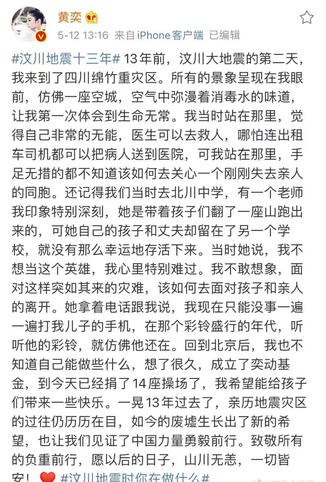 黄奕发文回忆亲历汶川地震灾区感受,为汶川捐建了14座操场